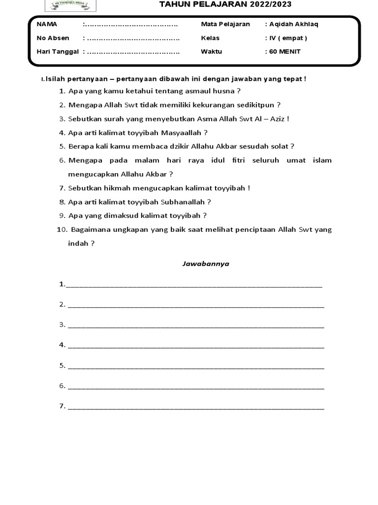 Soal-soal ini dibagi menjadi beberapa kategori untuk mencakup seluruh aspek materi Aqidah yang relevan bagi siswa kelas 4 SD.