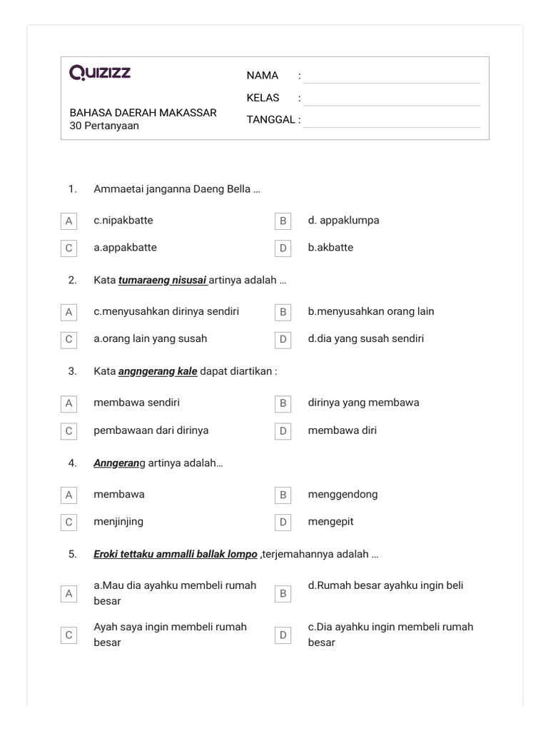 Soal-soal Bahasa Daerah Makassar untuk kelas 4 SD umumnya dirancang untuk menguji pemahaman siswa pada level dasar, mencakup berbagai aspek linguistik dan budaya. Berikut adalah beberapa tipe soal yang sering ditemui, beserta contoh dan penjelasannya: